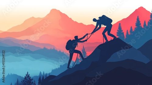 Silhouettes of two people climbing on mountain and helping. Teamwork of two men hiker helping each other on top of mountain. Help and assistance concept