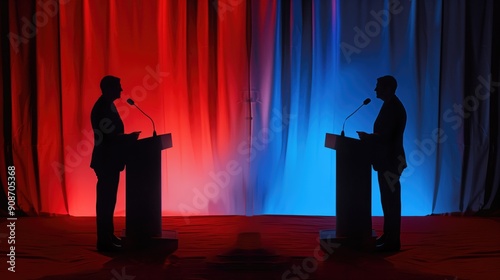 Silhouettes of two people debating at podiums with red and blue backlights. Concepts of politics, discussion, and contrasting viewpoints.