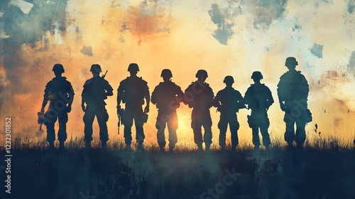 Silhouettes of Valor: A poignant and powerful silhouette of soldiers standing together, their forms starkly outlined against a dramatic sunset sky, a poignant reminder of their courage and sacrifice.