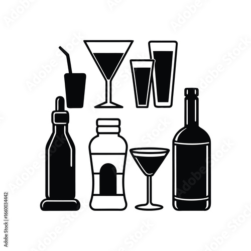 Silhouettes of various glasses isolated on white background. Vector illustration