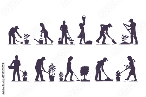 Silhouettes of workers performing outdoor tasks with tools. vector set of people digging, sweeping, raking, spraying, and cleaning.
