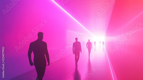 Silhouettes walking neon corridor, bright future, digital art, concept