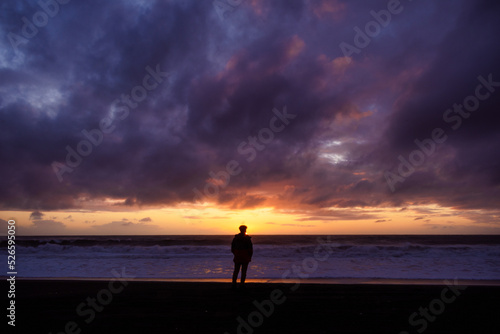 silueta de persona masculina parada en la orilla de la playa mirando al atardecer mientras el sol se oculta en el mar con nubes