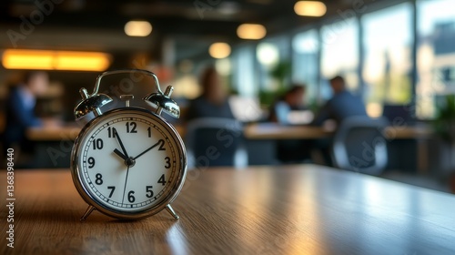 Silver Alarm Clock on Wooden Desk in Blurred Modern Office Setting