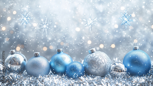 Silver background with blue Christmas ornaments and snowflakes, creating an elegant festive atmosphere. Sparkling lights for visual appeal. Perfect wallpaper or Christmas banner for holiday promotion.
