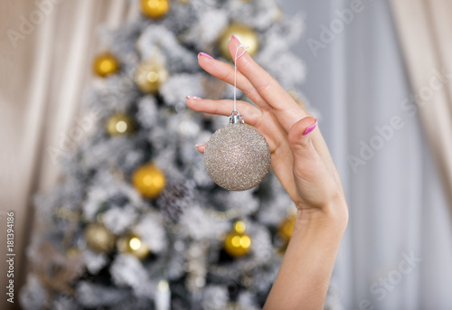 silver Christmas ball in a female hand, a Christmas tree decorated with toys and balloons in the background
