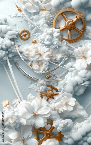 Silver clock ornament with snow and clouds background, featuring holiday decorations, including Christmas tree, gift, and jewelry elements in a festive winter setting