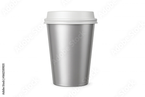 Silver disposable coffee cup with white lid, standing against transparent background, perfect for graphic design presentation