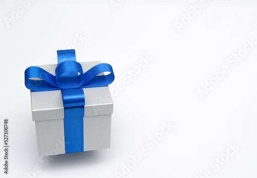 silver gift box with blue satin bow ribbon on white background
