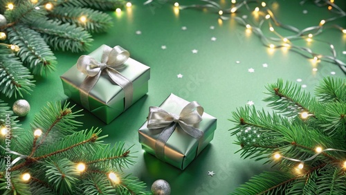 Silver Gift Boxes with Evergreen Branches and Festive Lights on Green Background