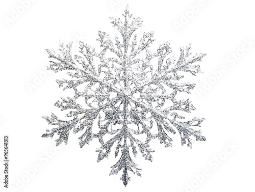 Silver glitter snowflake ornament with intricate details on a white background. PNG transparent.