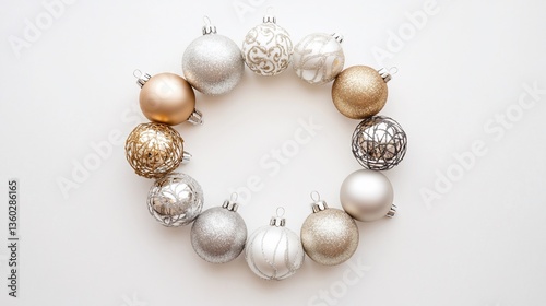 Silver gold Christmas ornaments circle white background holiday card