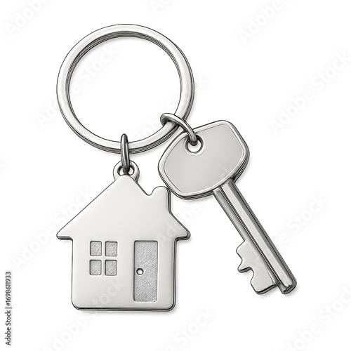 Silver House Shaped Keychain with a Key on a Grey Background home real estate isolated on a transparent background