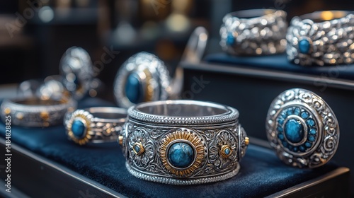Silver jewelry glitters on a velvet display, its intricate designs and polished surfaces showcasing the skill of the artisan and the allure of precious metals