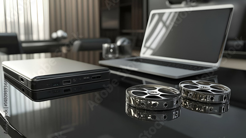 Silver Laptop and Black External Hard Drive on a Reflective Desk