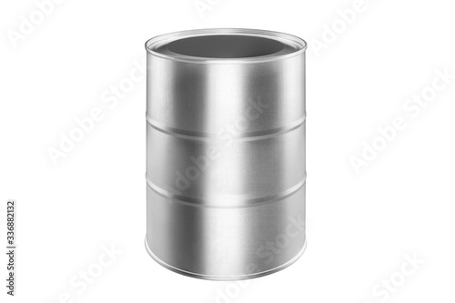 Silver metal barrel white background isolated close up, one round oil drum, steel keg, tin food can, canister, aluminium cask, petroleum storage packaging, fuel container, gasoline tank, canned goods