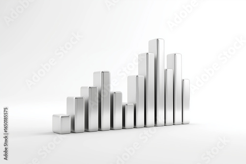 Silver metallic bar chart with smooth reflective surface on white background showing growth concept
