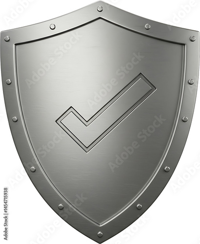 Silver Metallic Shield with Embossed Checkmark Displaying Protection, Security and Reliability in a Studio Setting on a Black Background.
