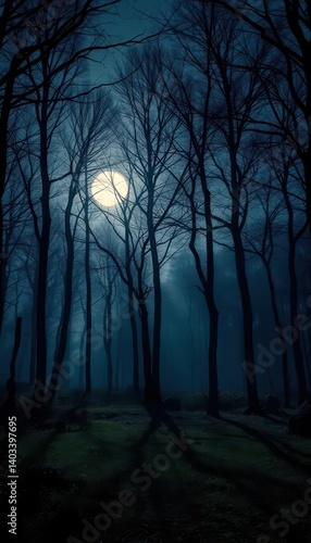 Silver moonlight bathes a tranquil forest, shadows long and still, night photography, silver