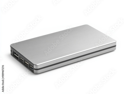 silver power bank with four usb ports isolated on white
