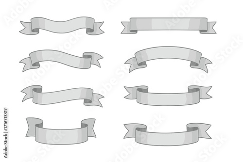 Silver ribbon banner vector set. Collection of elegant gray metallic scroll labels. Flat decorative graphic elements isolated on white background. Empty template design.