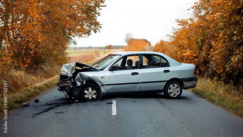 Silver Sedan Damaged in Road Collision During Autumn
