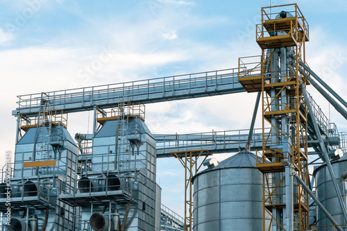 silver silos on agro manufacturing plant for processing drying cleaning and storage of agricultural products, flour, cereals and grain. Large iron barrels of grain. Granary elevator