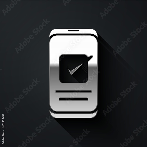 Silver Smartphone, mobile phone icon isolated on black background. Long shadow style. Vector.