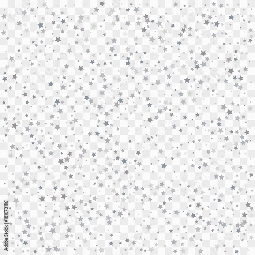 Silver star confetti rain festive holiday background. Vector silver paper foil stars falling down isolated on transparent background.