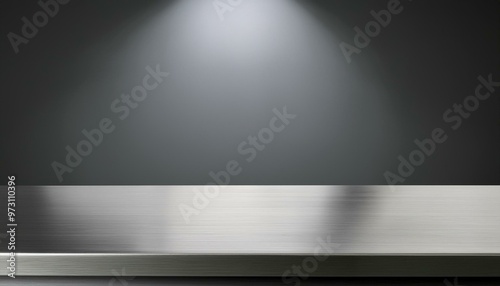 Silver steel countertop, empty shelf. Kitchen counter on gray background with spot light