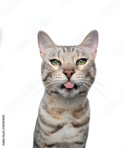 silver tabby bengal cat looking at camera sticking out tongue isolated on white background