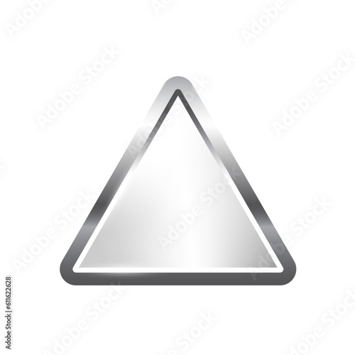 Silver triangle button with frame vector illustration. 3d steel glossy elegant design for empty emblem, medal or badge, shiny and gradient light effect on plate isolated on white background