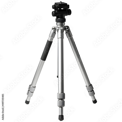 Silver Tripod with Adjustable Legs and Pan Tilt Head Standing on Black Backdrop Transparent Background