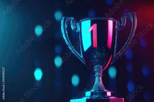 Silver trophy with the number 1 on it. The trophy is placed on a pedestal. The image has a futuristic and bright color scheme