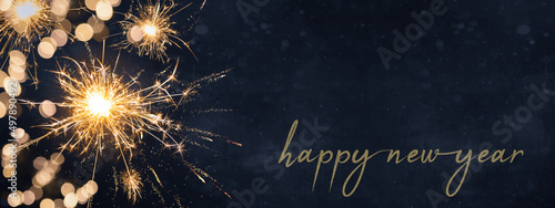 Silvester Party New year background banner panorama long, holiday greeting card - Sparklers and bokeh lights on dark night texture, with space for text
