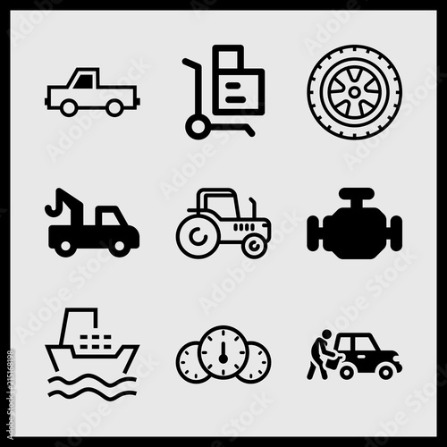Simple 9 icon set of car related engine, car, car board and truck with hook lift vector icons. Collection Illustration