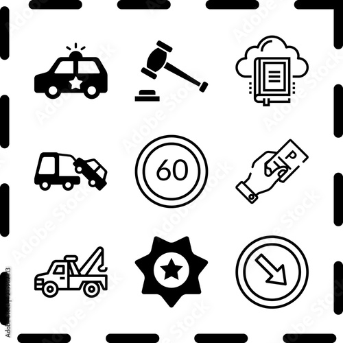 Simple 9 icon set of law related parking ticket, tow truck, speed limit and towing a car vector icons. Collection Illustration