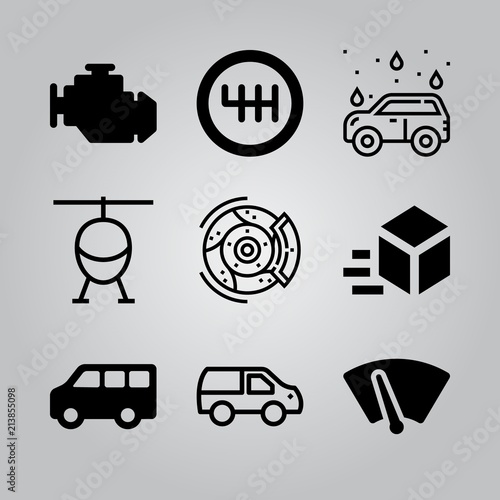 Simple 9 icon set of transport related windshield, helicopter, minibus and engine vector icons. Collection Illustration