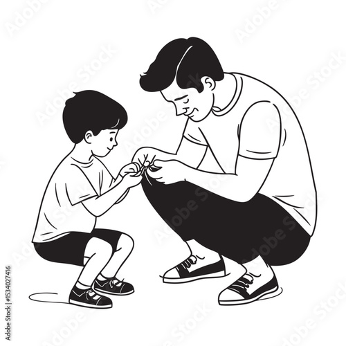 Simple and super minimal vector lines, cartoonish parent tying kid’s shoelaces lovingly