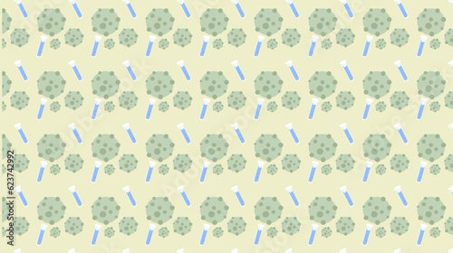 Simple background of seamless pattern with coronavirus and laboratory test tube on light green background. 2d illustration