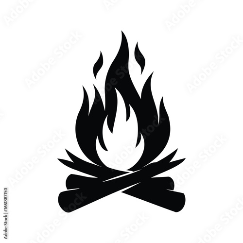 Simple black and white bonfire illustration with stacked wood and flames, campfire flame icon silhouette vector illustration