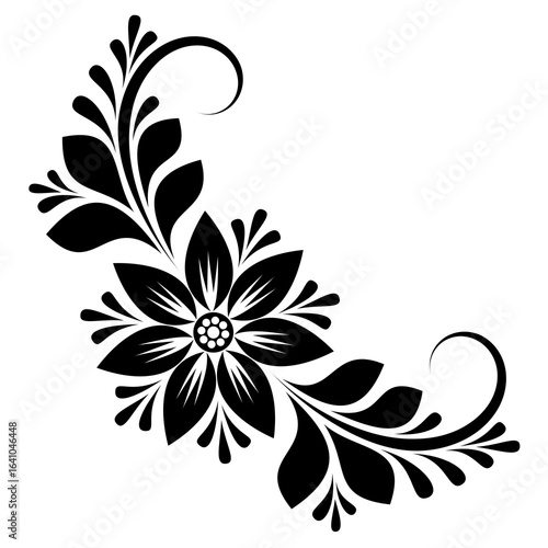 Simple black and white corner design element with single flower, leaves and swirls on white isolated background. Abstract floral pattern silhouette for stencil, tattoo.