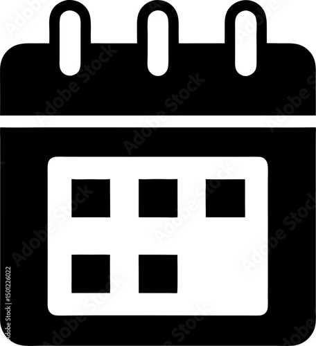 Simple black and white icon of a calendar represents dates and planning schedules
