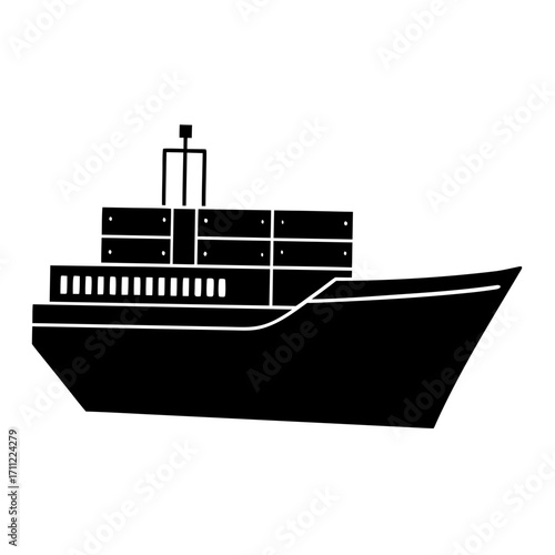 Simple black and white illustration of a cargo ship on white background