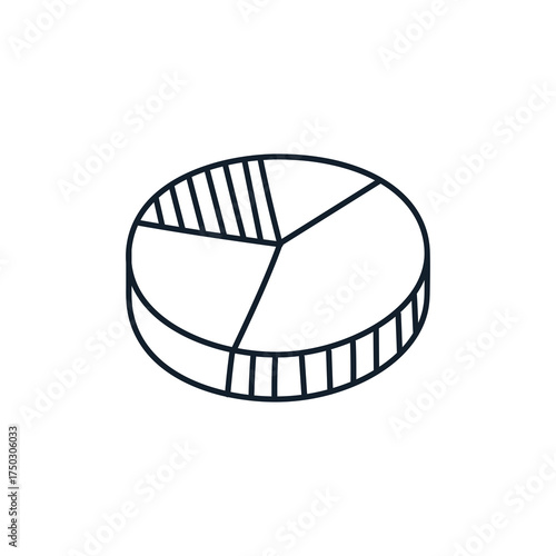 Simple black and white isometric doodle of a 3D pie chart with three segments one segment hatched against a transparent background