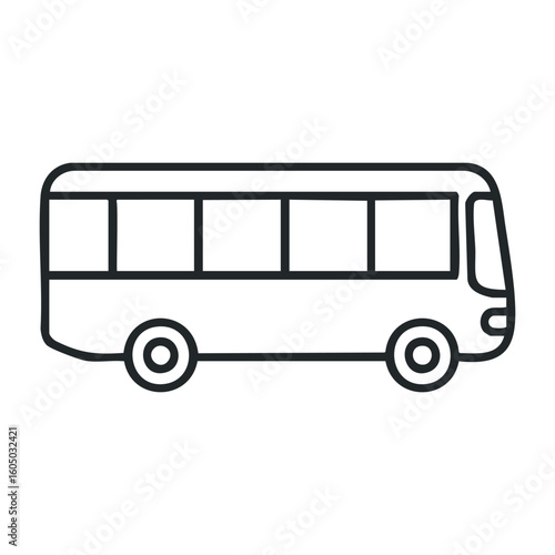 Simple black and white line drawing of a bus with windows and wheels. Vector illustration