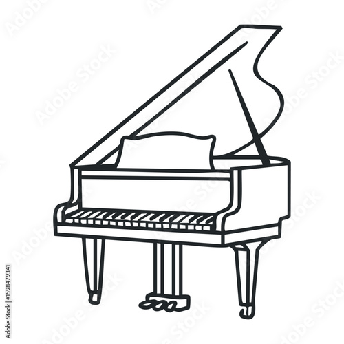 Simple black and white outline of a grand piano with raised lid and visible keys. Vector illustration