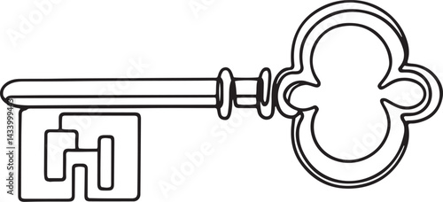 Simple black continuous line art illustration of an antique metal key in minimalist vector style isolated on white background for retro or mystery themed design