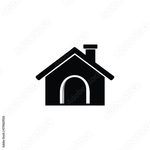 Simple Black House Icon with Roof, Chimney, and Arched Doorway on Transparent Background