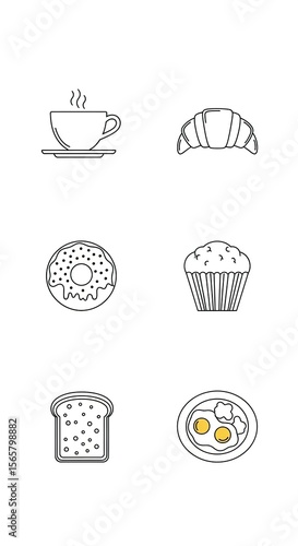 Simple Black Line Art Breakfast Food and Drink Icons on White Background